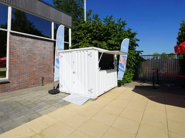 Le conteneur bar pliable blanc mesure environ 3×2 mètres et possède un auvent pliable, les dimensions sont à peu près les mêmes que celles d’un conteneur pliable de 10 pieds. C’est idéal pour les personnes qui attendent d’être au sec et cela donne au conteneur l’aspect d’un vrai bar. L’auvent peut également être verrouillé, de sorte que le conteneur bar peut être laissé avec les affaires à l’intérieur en toute sécurité. De plus, il y a une double porte sur le petit côté qui vous permet de faire entrer des objets volumineux comme un tonneau de bière. C’est donc la solution idéale pour proposer un bar lors d’événements. Un conteneur bar simple mais solide dans une couleur élégante et propre comme le blanc, RAL 9016.
