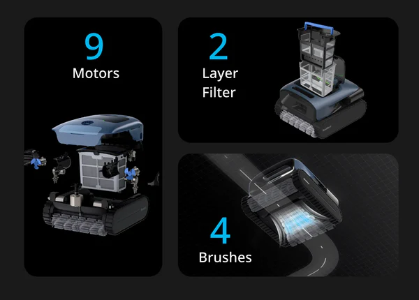 Libérez la puissance que votre piscine ne peut pas gérer !Bénéficiez d’une mobilité et de performances de nettoyage inégalées avec neuf moteurs puissants, un système de brosse à double rouleau à l’avant et à l’arrière et une double filtration ultra-fine jusqu’à 150 μm.